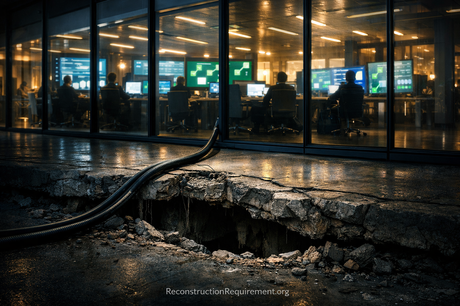 Modern corporate office running on AI systems with hidden structural dependency and weakened foundation beneath the building